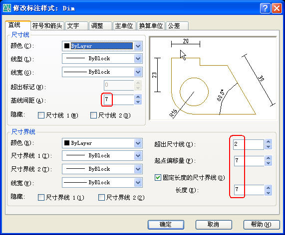 3、标注样式中的各种数量(指箭头大小、基线间距、文字高度等)设置,无论是布局(图纸空间)出图,还是模型空间出图,均采用实际图纸(指打印出来的A2、A3图纸)中的大小。比方说实际图纸中文字高3.5mm,那就设3.5。