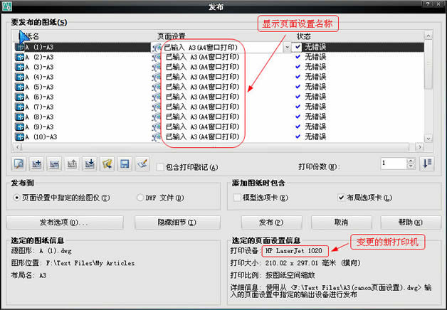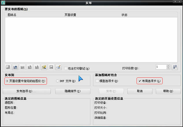 见下图,注意“发布到”选择“页面设置中指定的绘图仪”,且“添加图纸包含”选择“布局选项卡”。默认“模型选项卡”也是打钩的,我们这里是打印布局,不是打印模型,所以取消它。
