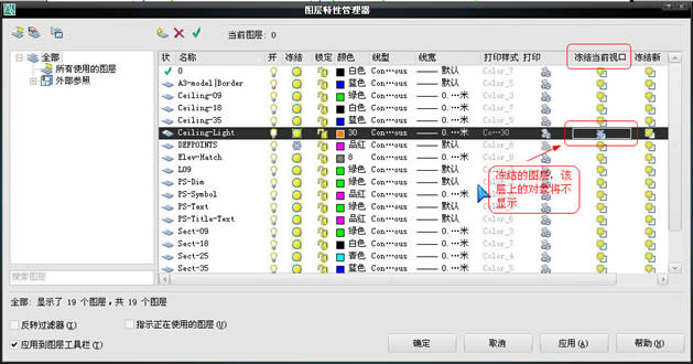 这是一个很重要的功能,比如可以利用此功能将平面布置图及顶棚平面图中的对象画在一个房间平面内,然后在布局中开两个视口(当然不在一个布局中也可以),分别显示平面布置图而隐藏顶棚平面图的对象(如灯具)和顶棚平面图而隐藏平面布置图的对象(如家具),以达到各取所需的目的。