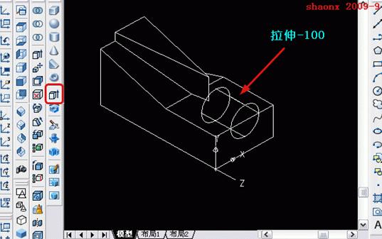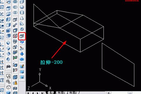5、点击“拉伸”命令,对如下图所示的一个面域拉伸-200(注意UCS中 Z 轴的方向,要摄入负值)。