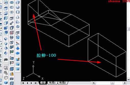 6、直接回车,继续“拉伸”命令,对另外两个面域拉伸-100