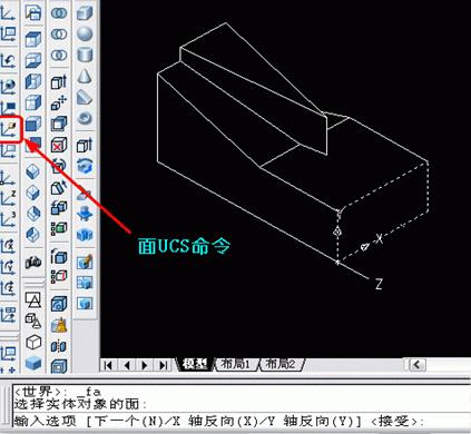 11、点击“面UCS”按钮,再点击选择实体最前端的面,使UCS坐标移动到这个面上,回车确认,就是使选择的面处于 XY 平面,便于后续的操作。