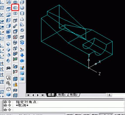15、用差集命令,从实体中减去这个圆柱体,如下图。