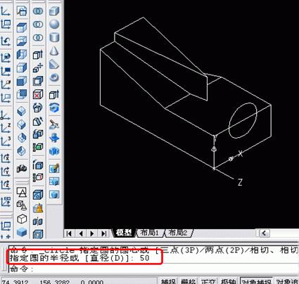 14、用拉伸命令,将刚画的圆拉伸100,注意UCS的 Z 轴方向,输入的值为负值。