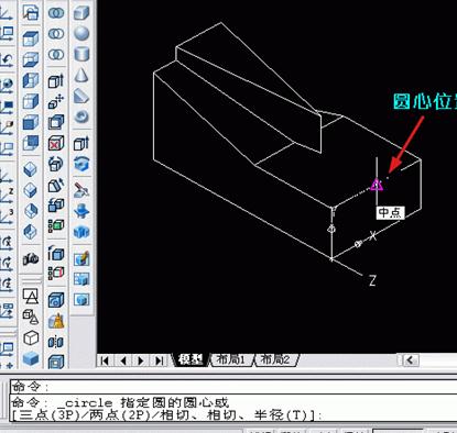 12、点击“圆”按钮,点击最前面平面的上端的中点,为画圆的圆心位置。