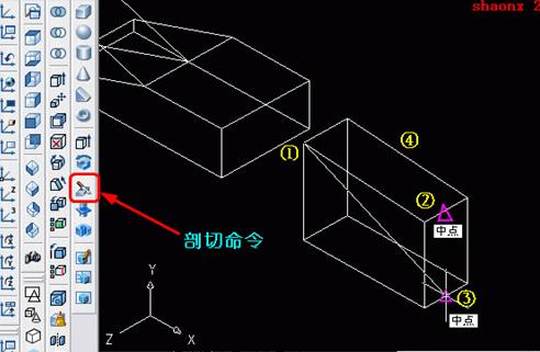 7、点击“剖切”命令,对右边的实体做剖切。依次指定实体上的三点,如下图中的①②③,即实体中的左后上角点、有前面的上下两个中点。选择完成后,再点击一下需要保留的④处附近。