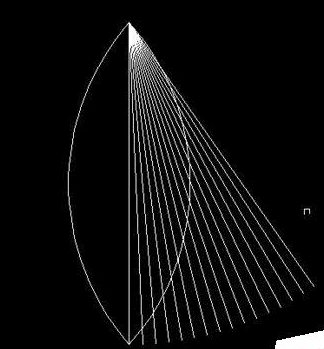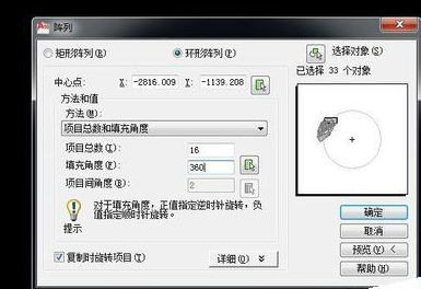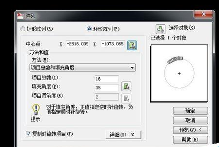 4、用ar(阵列)命令,然后选择“环形阵列”,选择对象为步骤3中的直线,中心点为直线最上方点,项目总数为16,填充角度为35°,然后点确定,得到如图所示的阵列图形。