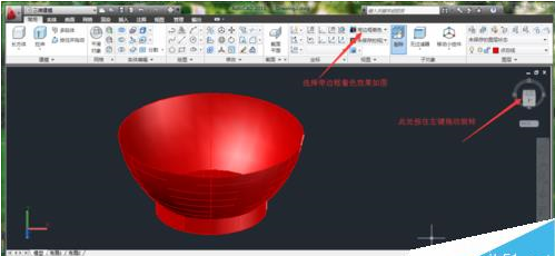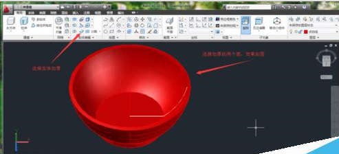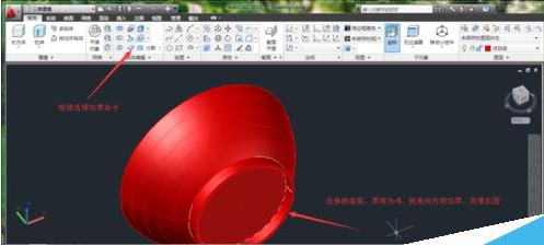 3、选择视觉样式为带边框着色,则生成实体颜色显示。选择实体编辑中的加厚命令,选取碗侧面和底面,进行加厚,完成后继续选择加厚命令,选取碗座面向内侧加厚。效果如图所示。