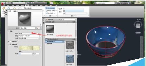 4、选择渲染,打开材质浏览器,选择材料为陶瓷,对碗进行渲染,结果如图。