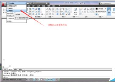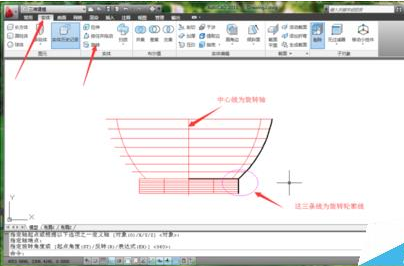 2、将工作空间调整到三维建模,操作如图。选择旋转命令,选择前面绘制的轮廓线为要旋转的曲线。选择中心直线为旋转轴,生成如图所示的效果。
