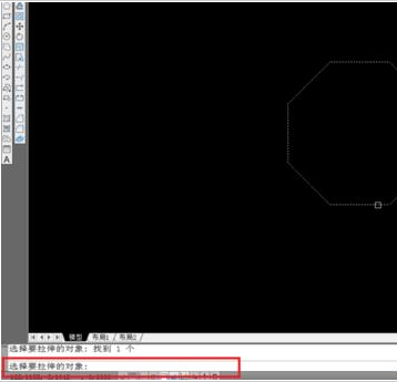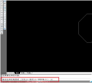 8、单击拉伸图标。跟着操作提示走。选择拉伸对象-----------点击8边形-----------右击确定,截图红框处着重看。