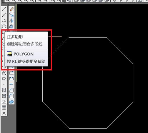 7、本例举例说明画一个8边形的柱体。使用正多边形的命令任意画一个尺寸的8边形。这里不详细说明。截图示意。红框处着重看。