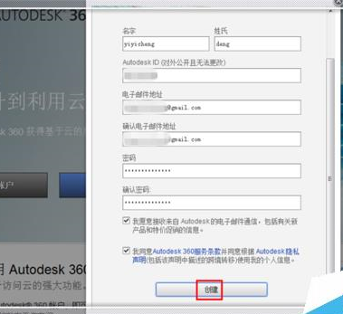 4、填写自己的名字、Autodesk ID、邮件地址、密码等信息。提醒,需要记住自己的Autodesk ID以及密码,这是登录个人云服务中的账号和密码,错了就无法登陆。填写完毕,勾上下面的同意条款,然后点击“创建”。