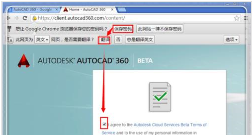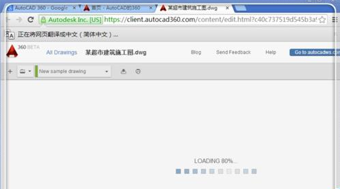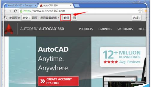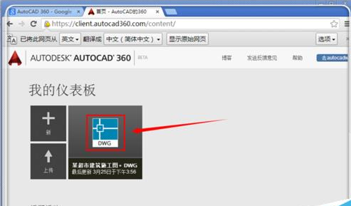 3、出现AutoCAD 360,由于默认的是英文版,但是这个浏览器会提示你是否翻译成中文,如果对英文不习惯,点击“翻译”可转换为中文页面。