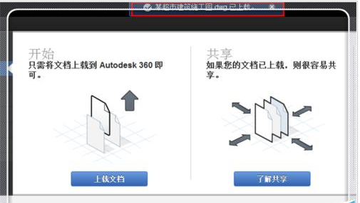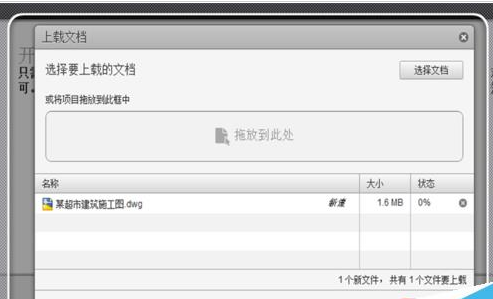 5、如果文件较小,上传就会较快;如果文件较大,则上传时间就会相对较多。上传完毕,在顶部就会出现“某超市建筑施工图”即你上传文档的名称,点击右上角的“x”,关掉这个提示信息即可。