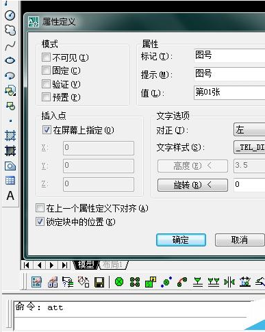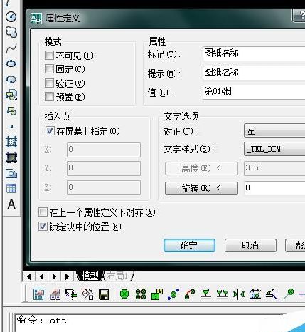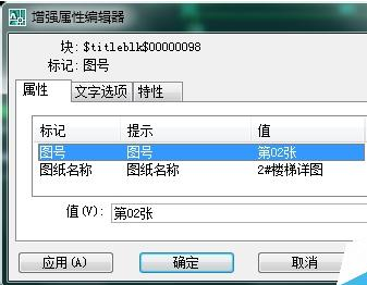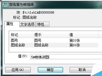 3、在属性栏修改标记:图纸名称,提示:图纸名称,值:第01张,将“图纸名称”插在修改图纸名称处