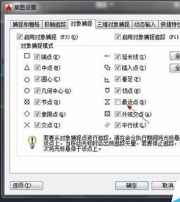6、其实,问题就处在这里。这样使得箭头在任何位置都被捕捉,最起码要勾去"最近点",才能实现自动追踪功能.