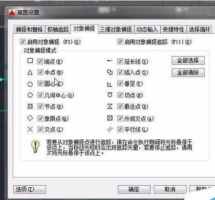 5、这时就要思考了,自动追踪一定与对象捕捉有关,我打开对象捕捉的对话框。有时候画图是经常为了快,经常勾选那个全部选择。
