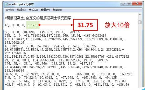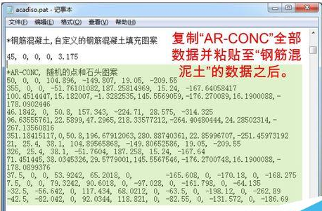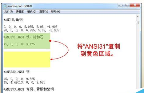1、将“ANSI31”图案的所有数据复制到记事本中的空白区域(即图中的黄色区域)。注意,一定不要插入到其他图案数据当中,以免造成混乱。
