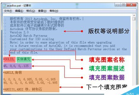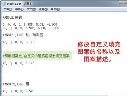 注意事项:“acadiso.pat”与“acad.pat”分别对应公制和英制,应根据绘图环境选择修改(如果不确定可对两者都进行修改)。