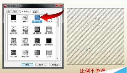 5、回CAD,调用填充命令,使用自定义的图案以检查其填充效果(如果未能找到刚刚定义的图案可以重新启动CAD)。从下图中可以看到两种图形显示比例不协调,斜线较密,需要进一步调整其比例。
