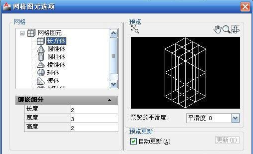 在CAD网格面板中,选择图元中的长方体,然后设置网格数,小编这里设置的参数为:2、3、2。如图所示: