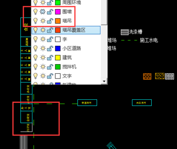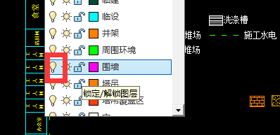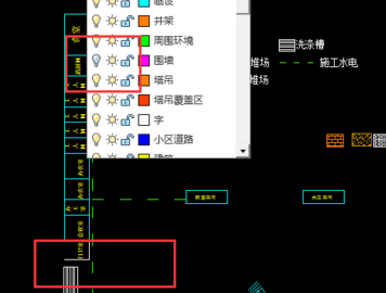 3下拉后可以看到很多图层,找到我们要关闭的对应的图层,如图,关闭图纸中红色虚线的围墙图层,点击围墙前面灯泡