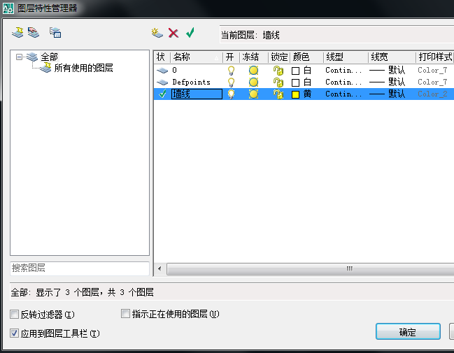 1打开CAD首先打开图层,在原有的基础上新建一个图层,名字改为墙线,一般墙线的颜色都为黄色。