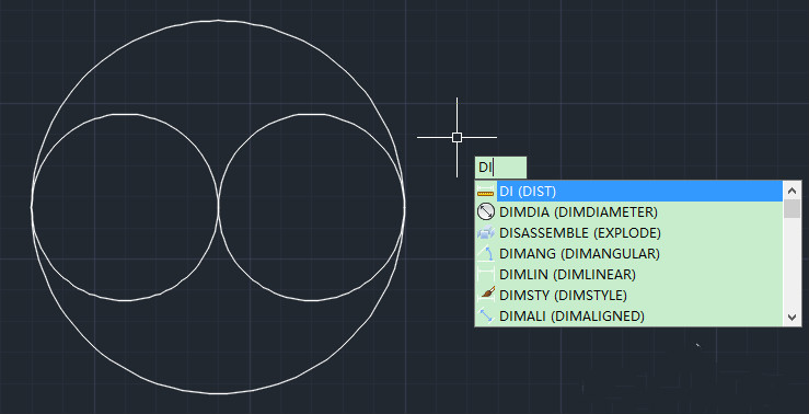3.画好以后三个圆两两相切,我们用di命令测量一下每个圆的直径。两个小圆直径都是60,大圆直径为120.