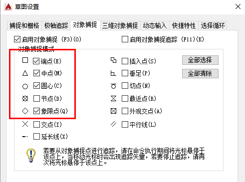 1.CAD因为其精准度可以轻松画出各类图形,这篇经验将介绍使用CAD画太极图的方法。首先我们画一个半径为60的一个圆,打开对象捕捉设置,勾选我们要用到的点,分别是圆心、端点、象限点。