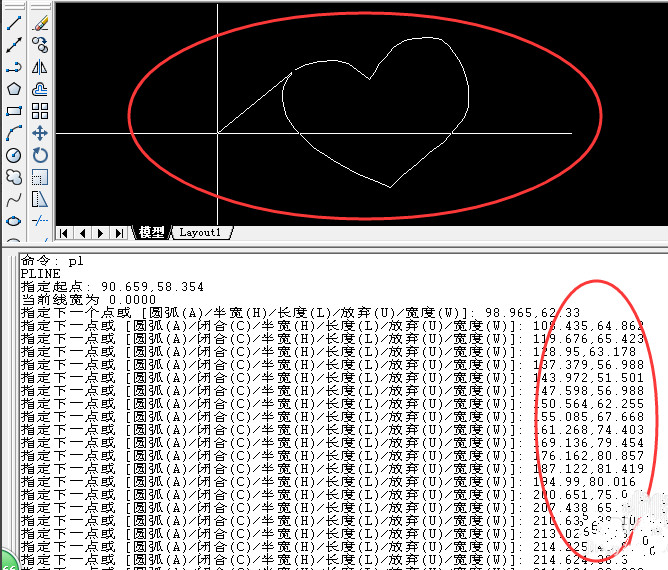 第六步:在cass成图软件命令栏中提示指定起点时,将第四步表中复制的坐标值内容,在该命令栏提示“指定起点:”后方右击黏贴,即可。如下图1为黏贴前,图2出现爱心形状的则是根据坐标内容自动连线的图形。这样就算完成在cass里实现坐标自动连线的功能咯!嘿嘿-最后记得保存成果图形哦。。。