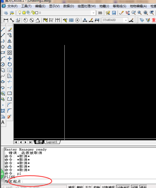 第五步:打开南方cass6.1成图软件,如图所示:在cass6.1成图软件左下角的”命令栏”中色,输入“PL”,在按“enter回车确定“或者“空格键”!将会提示指定起点。即图中红色圈圈的位置。”