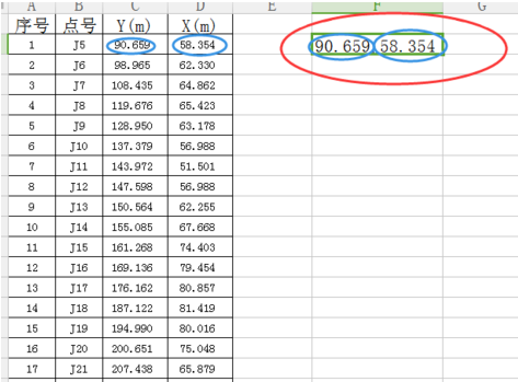第二步:首先在表中运用函数符号将所需的Y、X值合并为一个单元格,如图结果所示单元格F2中的蓝色圈圈值分别为1号点的Y与X值。(这里可以应用公式【=单元格&“,”单元格】这个公式)