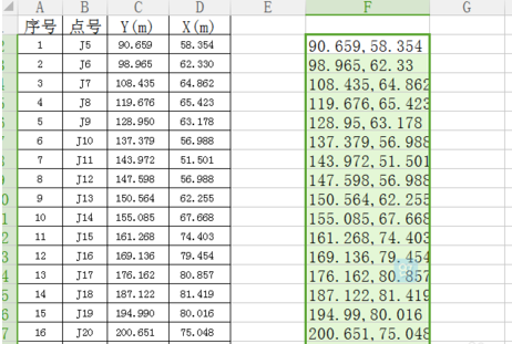 第三步:在以表中的F2单元格内容为准的基础下,将其余的各个点坐标都合并到各单元格中。(这里就利用选中单元格时,鼠标放置在单元右下角会出现,十字时标志,下拉即可。如下图所示)