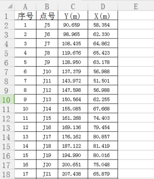 第一步:利用excel办公软件打开所需的坐标数据如下图3,显示出各个拐角点的Y、X的坐标值(保证Y值在前、X值在后)。