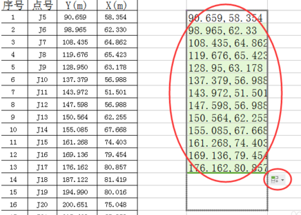 合并多个单元格数值内容时,这里必须是要以“,”逗号分隔才行,否则cass成图软件无法识别。