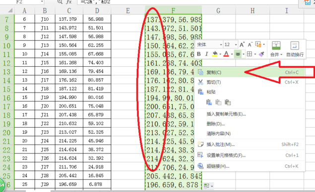 第四步:选择复制以上第三步所完成的F2下拉单元格各个点位所合并的坐标值内容。如下图所示全部为选中,右击“复制“,再打开CASS软件。