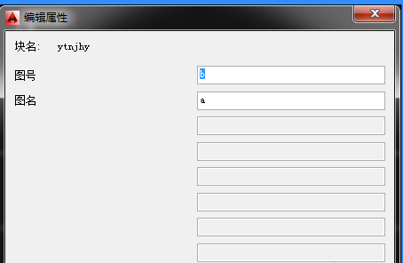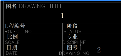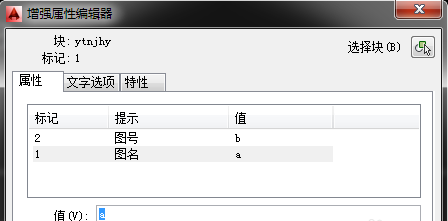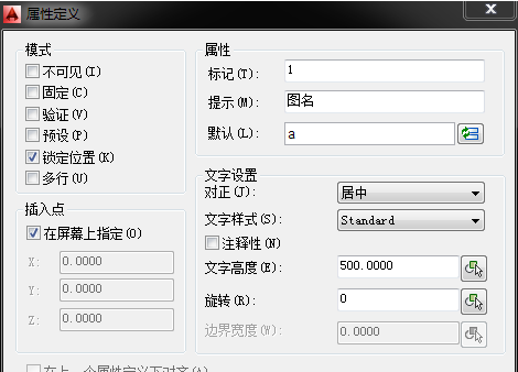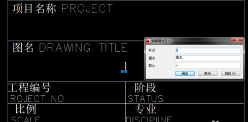 4.上图中“1”和“2”是两次att命令后的结果。下面要进行的步骤是,把图框和“1”“2”都选中,定义成块(块命令为“b”),定义成块后会出现如下对话框,在这个对话框中,左侧是“提示”项中的内容,右侧输入框中的内容为“默认”项中的内容(现在可更改,可不更改,这里先不更改),然后确定或关闭此对话框。