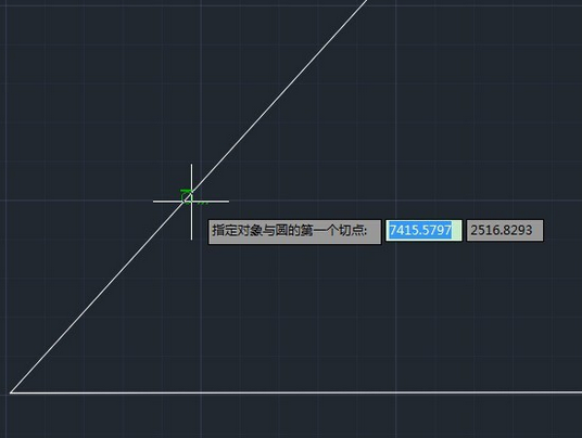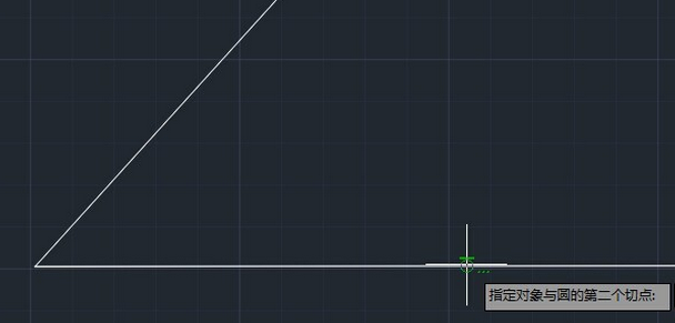 2、先用直线画一个夹角,点击圆——相切,相切,半径选项,光标移到直线上会出现绿色小圈圈,然后单击一下就选好切点了,两根直线都点一下,完成以后输入数字800,即半径长度,然后回车,就可以看见半径800的圆与两条直线相切了。