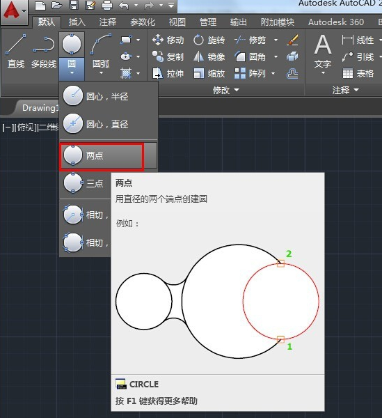 1、两点画圆就是指定两个点,最终画出来的圆是经过这两点的,连接这两点就是圆的直径。画法比较简单,选择圆——两点,在绘制区域指定两点即可。