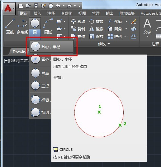 1、在上方工具栏找到圆,下拉菜单有多种画圆的方法,第一个“圆心,半径”是利用指定的圆心和半径来画的。第二个“圆心,直径”是利用指定的圆心和直径来画,两种方法使用上是一样的。