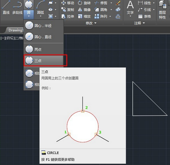 1、经过圆周上的三个点画圆,例如下面有一个三角形,要经过三角形的三个顶点画一个圆,在AI里面不太好画,但是CAD里面却很好实现,只需要点击圆——三点,然后在三个顶点上分别点一下就可以了。