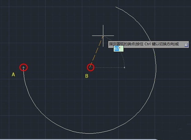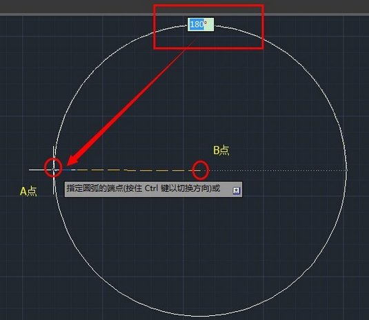6.继续移动光标到A点,也就是与A点重合,这个时候发现圆弧为180度,也就是一个圆了。