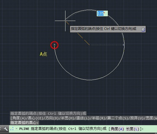 7.还是在圆心(ce)状态下,如果我们画圆弧画到135度,这个时候是不闭合的,输入cl,则会自动连接到A点,完成圆的闭合。