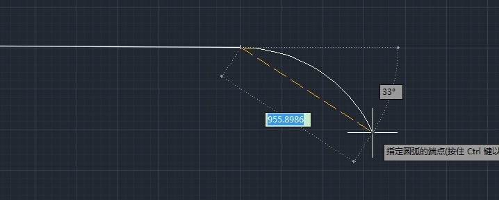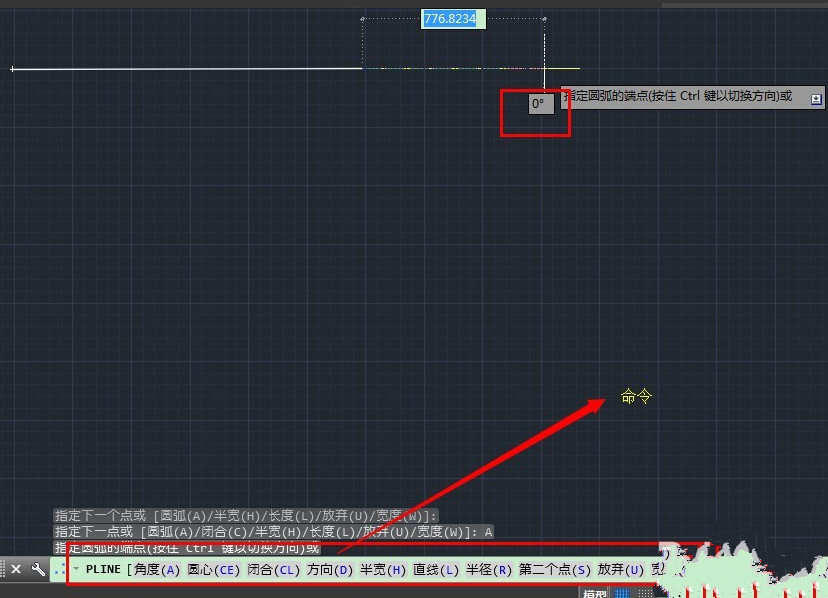 3.圆弧(A):我们输入A然后enter,继续拉鼠标,这时候我们看到延长的这段线角度为0,但当我们把鼠标往下拉的时候,角度也在发生变化,从0到33,再到最后的90度。原来的角度变成了圆弧,并且命令那里的圆弧(A)变成了角度(A),也就是说这两个命令是可以互相切换的。