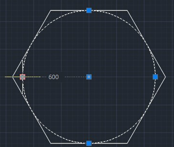 我们可以将圆画出来对比一下。我们首先来画内接于圆的情况。选择圆——三点选项,然后在左边的正六边形上任意三点点一下。画出来的圆就在多边形外面,并且其半径可以看出来是600