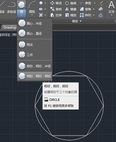 5.再次选择圆,这次选相切,相切,相切这个选项,在右边多边形任意三条边上点一下,画出来下图这样的圆,是与多边形内切的,并且圆的半径也是600.