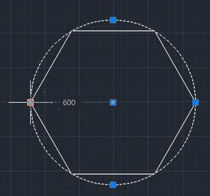 2.出现内接于圆和外切于圆两个选项,我们先用鼠标点击第一个选项,然后跳出来指定圆的半径选项,输入600,完成以后enter确认,就可以得到一个内接于圆的正六边形了。