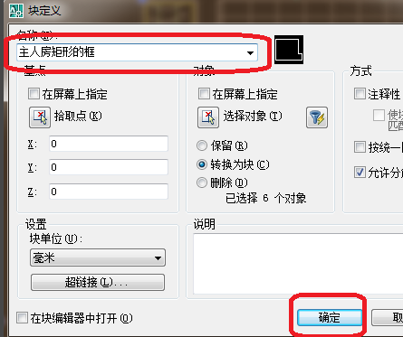 3、这里选择要输入的名称,这里写入主人房矩形框,这里只是为了方便看是哪里块,单击确定。
