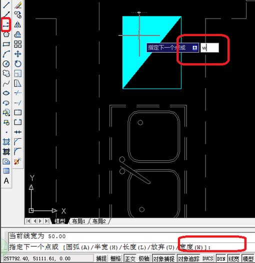 3、单击“多段线”在输入“W"在”空格“。